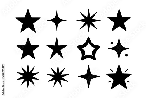 Black star silhouette bundle, 12-pointed rays, 5-point icons, twinkle sparkle burst variety, celestial night sky clipart, retro-modern emblem shapes for logo, badge, pattern, astronomy decor
