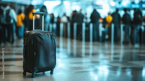 Black suitcase on a tiled floor in an airport with blurred people in the background.