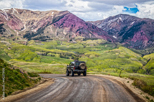 Black SUV with wheel cover and luggage on top drives around curve on wet dirt road with beautiful mountains and rainy sky in background
