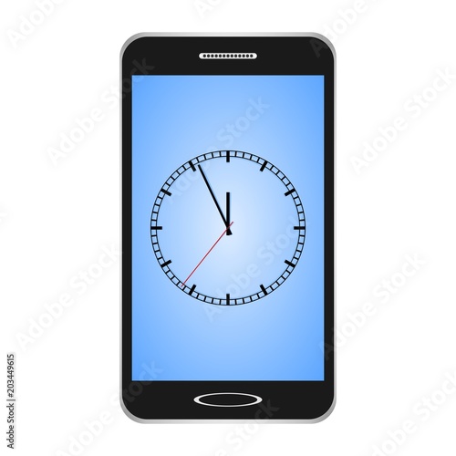Black switched smartphones with blue display with a touch screen with wall clock with a dial and a black rectangle of black circles with black hands and a red second hand on a white background.