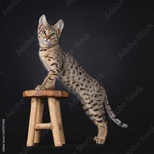 Black tabby spotted cat kitten, standing side ways with paws on little wooden stool. Looking towards camera. Isolated on a black background.