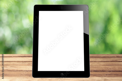 Black tablet with dark screen on wooden table with blurred nature outdoor