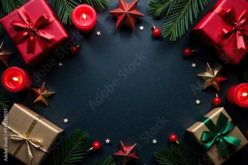 Black tabletop adorned with festive presents and candles, dark surface, sparkling elements