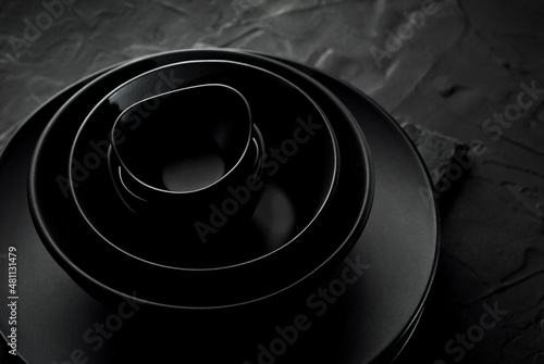 Black tableware on a dark background. Plates and bowls of different shapes and sizes are stacked in a pile. Contrasting dramatic light as an artistic effect.