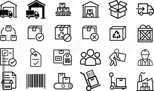 Black thin line warehouse and inventory icons, minimalist outline on white: warehouse, shelves, pallet, forklift, truck, boxes, crate, container, barcode, chart, truck, conveyor, clipboard, worker.