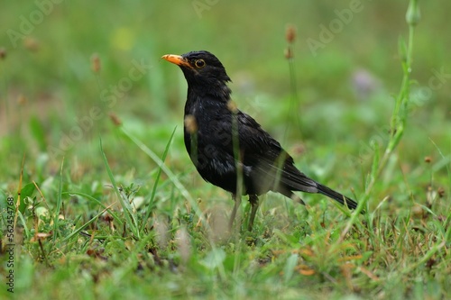Black thrush with orange beak jumps in the grass and looks for food