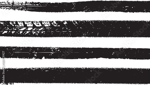 Black Tire Marks on White Background: Horizontal Stripes, Tread Marks, Rubber Imprints, and Signs of Wear