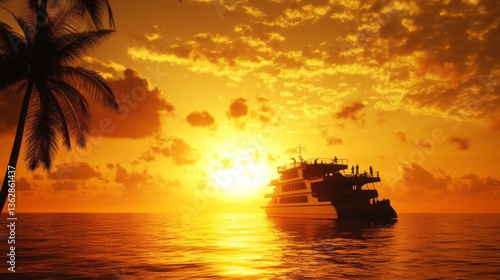 Black tourists enjoying a sunset boat cruise on a tropical island with golden skies