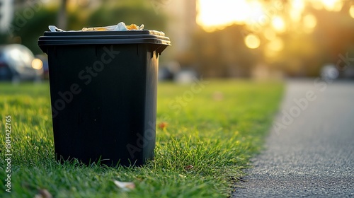 Black trash bin on green grass near asphalt road in the outdoor environment