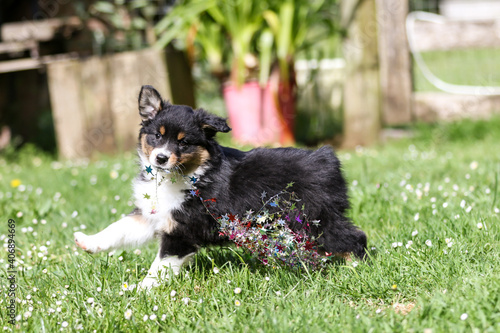 black tri Australian Shepherd with christmas