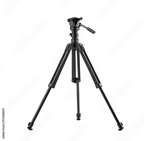 Black tripod standing, isolated on black background, photography equipment, studio shot