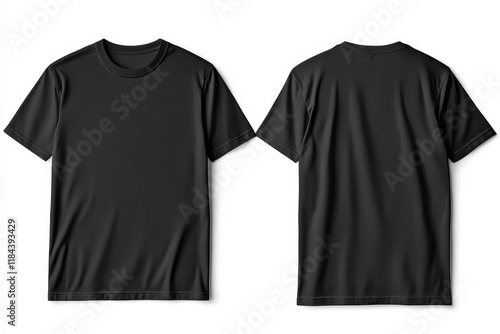 Black T-shirt mockup, front and back views, isolated on white background, design template