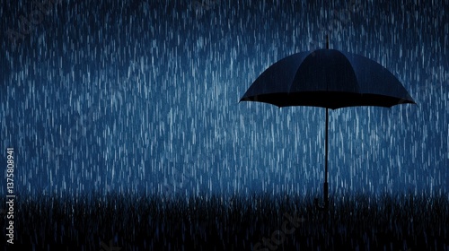 Black Umbrella Standing Alone in Heavy Rainfall a Dark Moody Image of Solitude and Protection