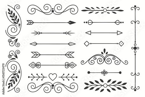 Black Vector Dividers Featuring Arrows, Floral Swirls, and Curves in Elegant Hand-Drawn Style. Ornamental Borders for Invitations and Layout Projects.