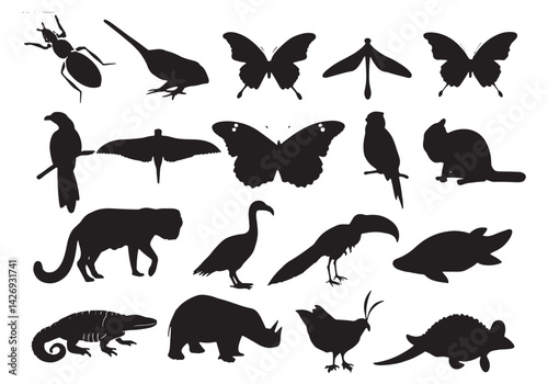 Black vector illustration set showcases animal silhouettes, including bird, fish, and wildlife icons, a nature collection with flying wings and a shark outline