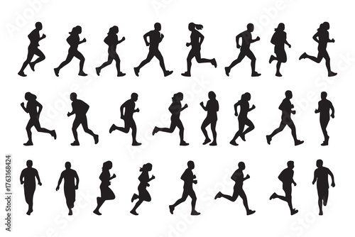 Black vector silhouettes of people including women, men, a child, runners, and dancers for sport, business, or family illustration