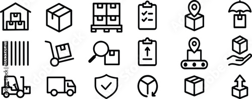 Black Vector Silhouettes of Warehouse and Inventory Icons – Adjustable Line Weight Logistics and Supply Chain Symbol Set on White Background
