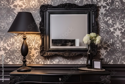Black vintage ornate frame in classic style. Dark gothic royal frame in the room. Generated AI.