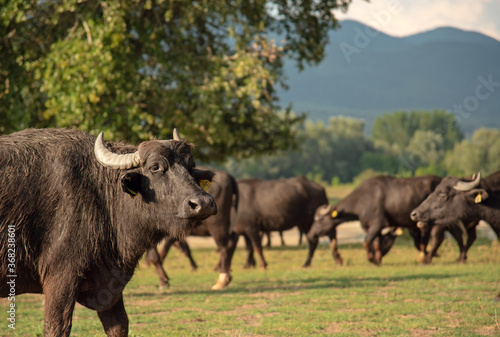 Black water buffalo grazing at beautiful meadow at sunset