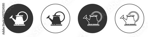 Black Watering can icon isolated on white background. Irrigation symbol. Circle button. Vector Illustration.