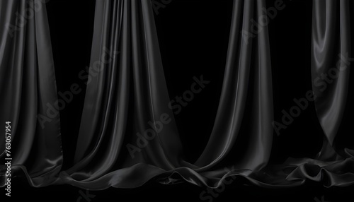 Black wavy silk drapery curtains falling off on a dark velvet studio background
