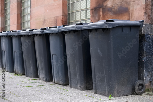 Black wheelie bins in a row on street with house numbers printed on front waiting for bin men to collect