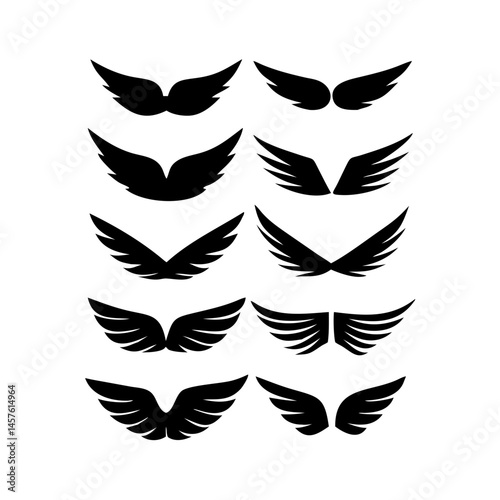 Black wings icon set. Wings icons. Collection badges of wings. Vector illustration. Set of wings icons. Collection wings badges. Vector illustration. Silhouette Vector Black. with white background