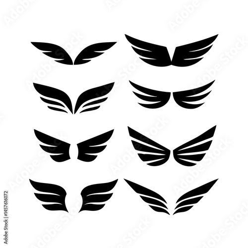 Black wings icon set. Wings icons. Collection badges of wings. Vector illustration.Set of wings icons. Collection wings badges. Vector illustration.Silhouette Vector Black. with white background