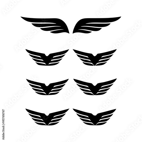 Black wings icon set. Wings icons. Collection badges of wings. Vector illustration.Set of wings icons. Collection wings badges. Vector illustration.Silhouette Vector Black. with white background