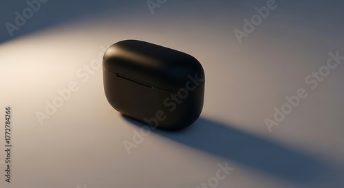 Black Wireless Earbuds Case Minimalist Still Life on White Tabletop with Dark Shadow