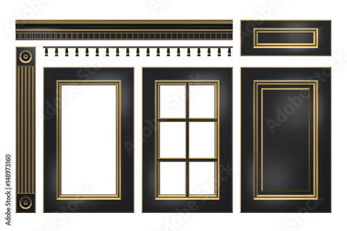 Black with gold door, drawer, column, cornice for kitchen cabinet isolated on white