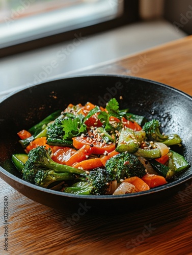 Black wok filled with a colorful stir-fry dish on a wooden table. the dish appears to be made with broccoli, carrots, and other vegetables, and is garnished with sesame seeds and fresh cilantro.