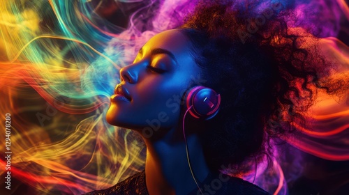 Black woman listening to music surrounded by abstract background and colorful wavy smoke. Music party promotional video. Colorful dynamic sound waves and abstract digital light effects