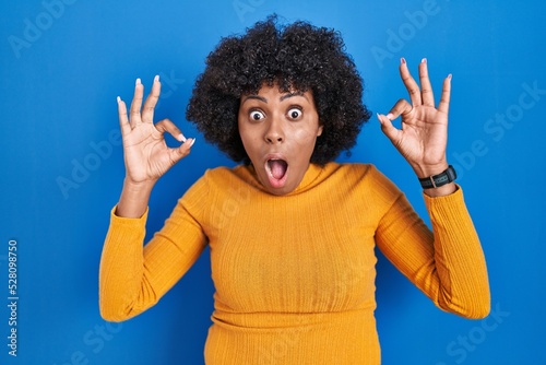 Black woman with curly hair standing over blue background looking surprised and shocked doing ok approval symbol with fingers. crazy expression