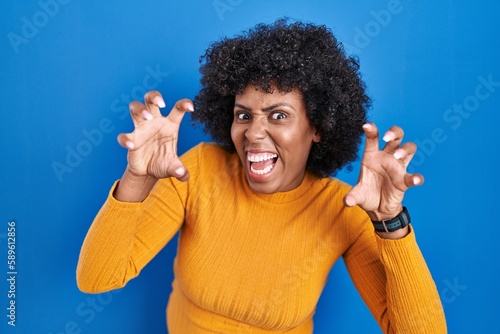Black woman with curly hair standing over blue background smiling funny doing claw gesture as cat, aggressive and sexy expression