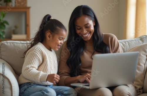 Black woman with long hair smiling with a computer sits on a sofa, a child plays nearby, woman smiling to her child