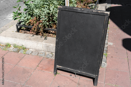 Black wooden sandwich board on the street, copy empty space, mock-up, background .