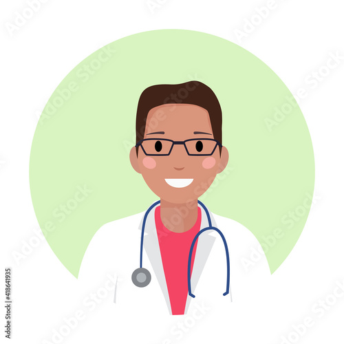 Black young male doctor in medical white coat with glasses and stethoscope. African american physician professional avatar, silhouette, profile, man icon for web site, app. Flat vector illustration.