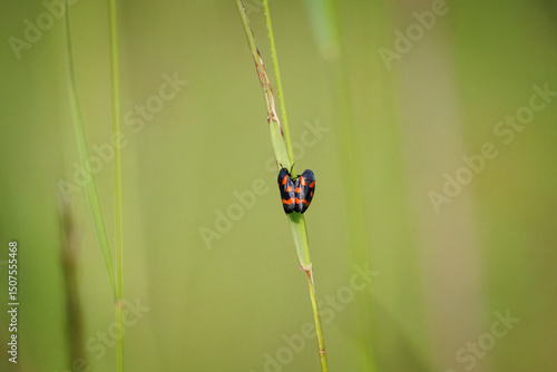 Black-and-red froghoppers mating on a blade of grass against a light green background on a sunny spring evening.