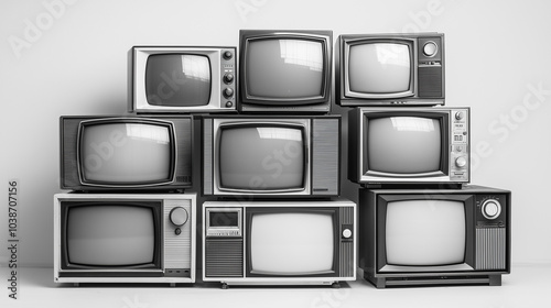 Black-and-White Photograph of Stacked Vintage Televisions