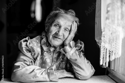 Black-and-white portrait of an elderly woman in ethnic dress at home.