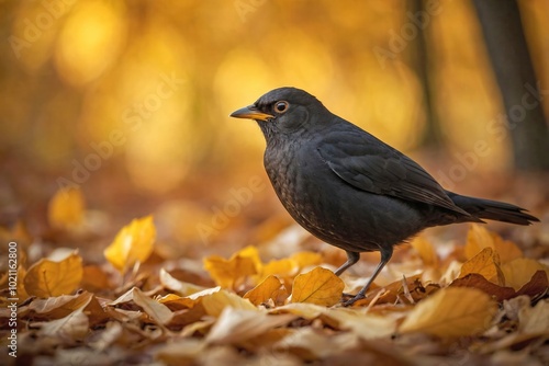 Blackbird Among Golden Autumn Leaves