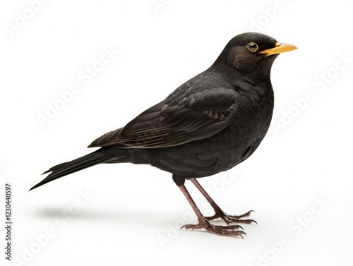 Blackbird Standing Proud. Beautiful Wild Animal in Black Plumage, Isolated on White Background for Studio Photography