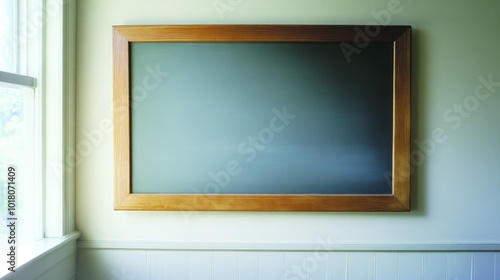 Blackboard with green background in school room and wooden frame, with white space on the board for writing or drawing on white wall background
