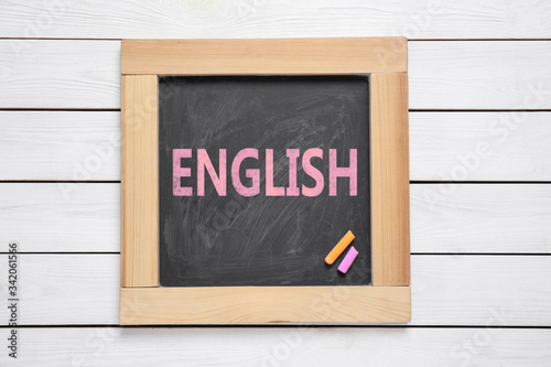 Blackboard with word ENGLISH and pieces of color chalk on white wooden background, top view