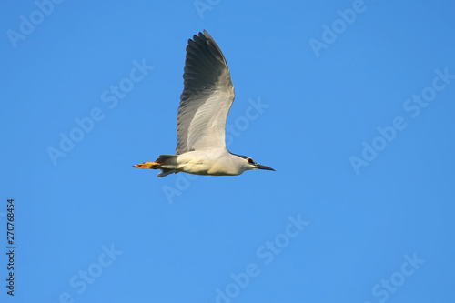 black-crowned night heron (Nycticorax nycticorax) photographed in flight against a blue sky
