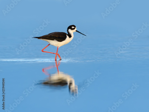 Black-necked Stilt with Reflection Foraging on the Pond with Blue Water