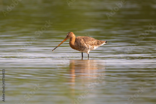 Black-tailed godwit (Limosa limosa) at Isonzo river mouth nature reserve, Isola della Cona, Friuli Venezia Giulia, Italy. Large, long-legged, long-billed shorebird. Copy space image.