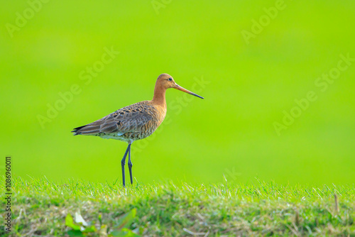 Black-tailed godwit Limosa Limosa foraging in a green meadow