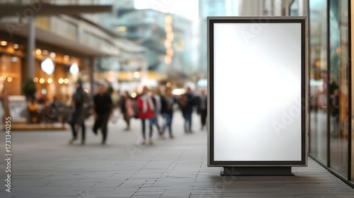 Blank Advertisement Display in an Urban Outdoor Setting with Restaurant and Shoppers in the Background